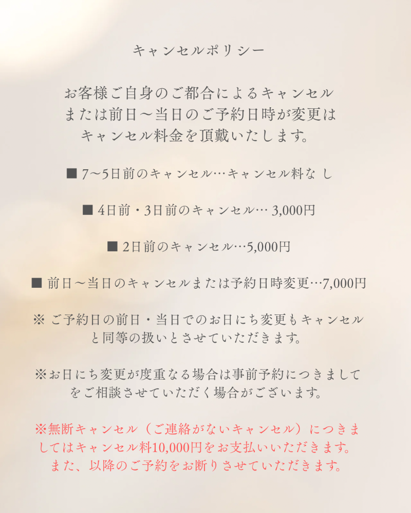 ・ご予約時間を15分過ぎてもご連絡、またはご来店がない場合は自動キャンセルとさせていただきます。ご来店された場合も、ご希望のデザインやメニューには添いかねますのでご了承下さい。