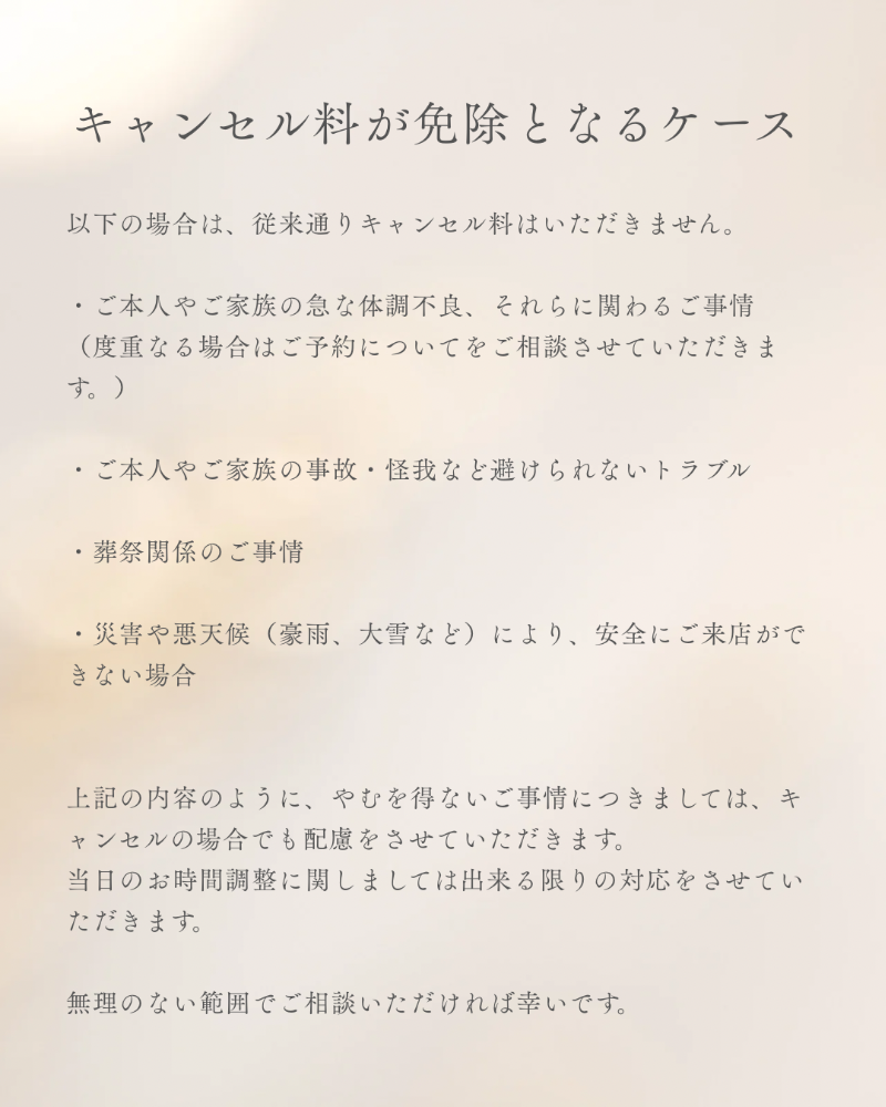 (ご自身やご家族の急病、お身内のご不幸等、天災などやむを得ない事情でのご変更やキャンセルは除く)